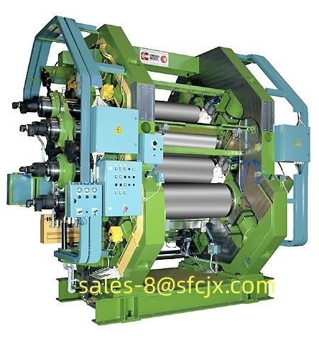 The machine may also include additional features such as temperature control systems, cooling mechanisms, and trimming devices to enhance the calendering process and achieve the desired final product specifications.